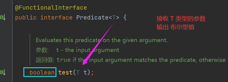 | 断定值 | Predicate | boolean test(T t) | T | boolean |