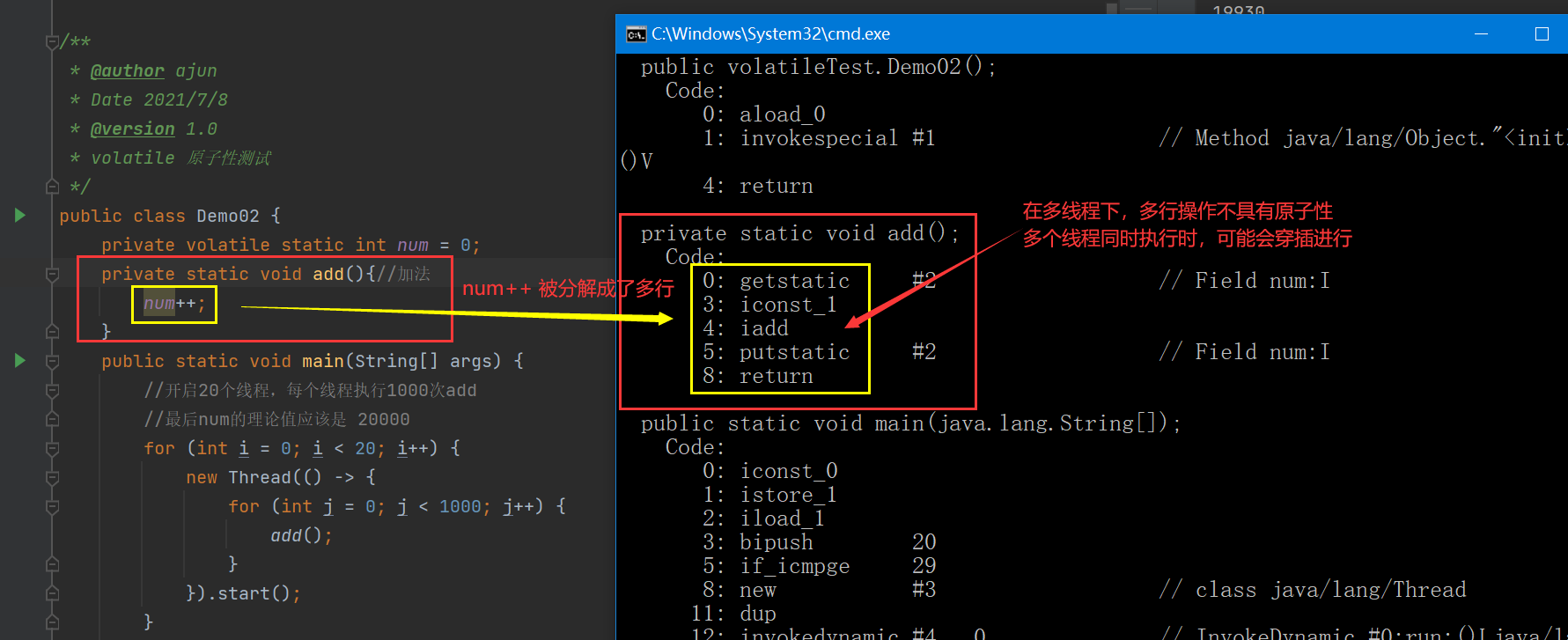 对class文件反编译后发现,add方法中的 num++ 操作,被分成好几步来完成,在多线程情况下,这几步不是一个整体,不具有原子性,多个线程中这几步操作可能会穿插执行
