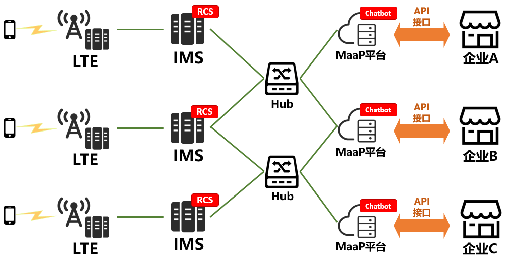 为了实现RCS商业富媒体消息,运营商在自身网络上架设了MaaP能力增强开放平台和Chatbot聊天机器人。平台面向企业开放API接口,以提供服务。
