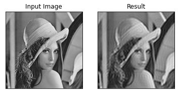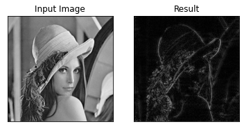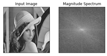 # 3. 傅里叶变换 import numpy as np import cv2 from matplotlib import pyplot as plt img = cv2.imread('D:/pycharm/pycharm-cope/opencv/resource/photo/13_Lena.jpg',0) img_float = np.float32(img) # 输入图片转换成 np.float32 格式 dft = cv2.dft(img_float, flags = cv2.DFT_COMPLEX_OUTPUT) # 傅里叶变换 dft_shift = np.fft.fftshift(dft) # 将低频值,频率为 0 的部分转换到中间的位置 # 得到灰度图能表示的形式 magnitude_spectrum = 20 * np.log(cv2.magnitude(dft_shift[:,:,0],dft_shift[:,:,1])) # 对两个通道进行转换才能得到图像形式表达,由于转换后的值为非常小的数值,因此还要转换到 0-255 之间 plt.subplot(121), plt.imshow(img,cmap = 'gray') plt.title('Input Image'), plt.xticks([]), plt.yticks([]) plt.subplot(122), plt.imshow(magnitude_spectrum, cmap = 'gray') plt.title('Magnitude Spectrum'), plt.xticks([]), plt.yticks([]) # 越往中心频率越低(被 shift 拉到中间),越往两侧频率越高 plt.show() import numpy as np import cv2 from matplotlib import pyplot as plt img = cv2.imread('D:/pycharm/pycharm-cope/opencv/resource/photo/13_Lena.jpg',0) img_float32 = np.float32(img) # DFT ( 傅里叶变换 ) dft = cv2.dft(img_float32, flags = cv2.DFT_COMPLEX_OUTPUT) dft_shift = np.fft.fftshift(dft) rows, cols = img.shape crow, ccol = int(rows/2), int(cols/2) # 中心位置 # 低通滤波 mask = np.zeros((rows,cols,2),np.uint8) # 全是0的全部保留 mask[crow-30:crow+30,ccol-30:ccol+30] = 1 # 只保留中心点周围的区域,中心点为最低频的 # IDPT (傅里叶逆变换) fshift = dft_shift * mask # 用掩码提取 dft_shift 中相应区域,是 1 就保留,不是 1 就过滤了 f_ishift = np.fft.ifftshift(fshift) # 把拉到中心位置的频谱区域给还原回去,依旧回到左上角 img_back = cv2.idft(f_ishift) img_back = cv2.magnitude(img_back[:,:,0],img_back[:,:,1]) # 将实部和虚部结合起来,才能将傅里叶变换的结果显示出来 plt.subplot(121),plt.imshow(img,cmap='gray') plt.title('Input Image'), plt.xticks([]), plt.yticks([]) plt.subplot(122), plt.imshow(img_back,cmap='gray') plt.title('Result'), plt.xticks([]), plt.yticks([]) plt.show() import numpy as np import cv2 from matplotlib import pyplot as plt img = cv2.imread('D:/pycharm/pycharm-cope/opencv/resource/photo/13_Lena.jpg',0) img_float32 = np.float32(img) dft = cv2.dft(img_float32,flags=cv2.DFT_COMPLEX_OUTPUT) dft_shift = np.fft.fftshift(dft) rows, cols = img.shape crow, ccol = int(rows/2), int(cols/2) # 中心位置 # 高通滤波 mask = np.ones((rows,cols,2),np.uint8)# 全是1的全部保留 mask[crow-30:crow+30,ccol-30:ccol+30] = 0 # 中间区域置 0,外面的区域置 1 # IDFT fshift = dft_shift * mask f_ishift = np.fft.ifftshift(fshift) img_back = cv2.idft(f_ishift) img_back = cv2.magnitude(img_back[:,:,0],img_back[:,:,1]) plt.subplot(121),plt.imshow(img,cmap = 'gray') plt.title('Input Image'), plt.xticks([]),plt.yticks([]) plt.subplot(122),plt.imshow(img_back,cmap='gray') plt.title('Result'),plt.xticks([]),plt.yticks([]) plt.show()