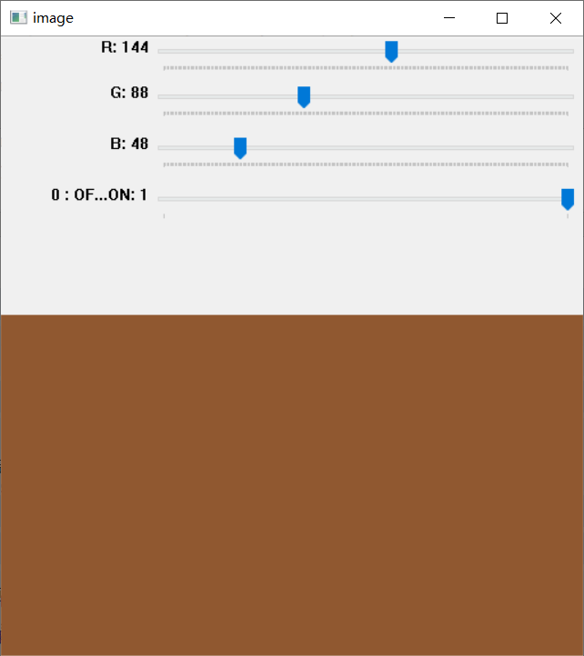 """在这里,我们将创建一个简单的应用程序,以显示您指定的颜色。您有一个显示颜色的窗口, 以及三个用于指定B、G、R颜色的跟踪栏。滑动轨迹栏,并相应地更改窗口颜色。 默认情况下,初始颜色将设置为黑色。""" import numpy as np import cv2 as cv def nothing(x): pass # 创建一个黑色的图像,一个窗口 img = np.zeros((300,512,3), np.uint8) cv.namedWindow('image') # 创建颜色变化的轨迹栏 cv.createTrackbar('R', 'image', 0, 255, nothing) cv.createTrackbar('G', 'image', 0, 255, nothing) cv.createTrackbar('B', 'image', 0, 255, nothing) # 为 ON/OFF 功能创建开关 switch = '0 : OFF \n1 : ON' cv.createTrackbar(switch, 'image', 0, 1, nothing) while(1): cv.imshow('image',img) k = cv.waitKey(1) & 0xFF if k == 27: break # 得到四条轨迹的当前位置 r = cv.getTrackbarPos('R','image') g = cv.getTrackbarPos('G','image') b = cv.getTrackbarPos('B','image') s = cv.getTrackbarPos(switch,'image') if s == 0: img[:] = 0 else: img[:] = [b, g, r] cv.destroyAllWindows()