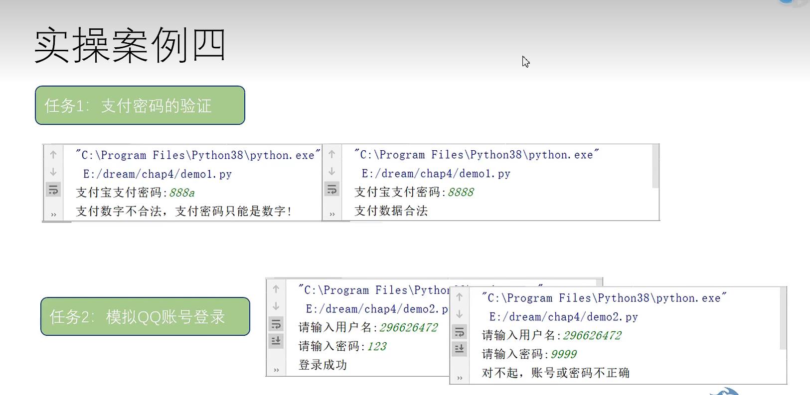 # 模拟支付密码的验证 pwd = input('支付宝支付密码:') if pwd.isdigit():# isdigit判断支付密码是否全部为数字 print('支付数据合法') else: print('支付数字不合法,支付密码只能是数据') print('-----------------------------------') print('支付数据合法'if pwd.isdigit() else '支付数字不合法,支付密码只能是数据' )