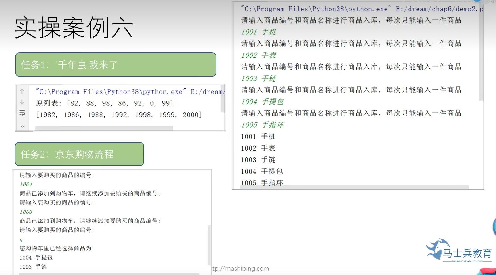 lst = [] for i in range(0, 5): goods = input('请输入商品编号和商品名称进入商品的入库,每次只能输入一件商品:\n') lst.append(goods) for item in lst: print(item) cart = [] while True: num = input('请输入要购买的商品编号:') for item in lst: # 在item当中查找num,find查询结果是没有找到会返回-1,所以等于-1,代表找到了 if item.find(num) != -1: cart.append(item) break if num == 'q': # 退出while循环 break print('您购物车里已经选好的商品为:') # for m in cart: # print(m) # 逆序输出 for i in range(len(cart)-1, -1, -1): print(cart[i]) # for i in cart[::-1]: # print(cart[i])