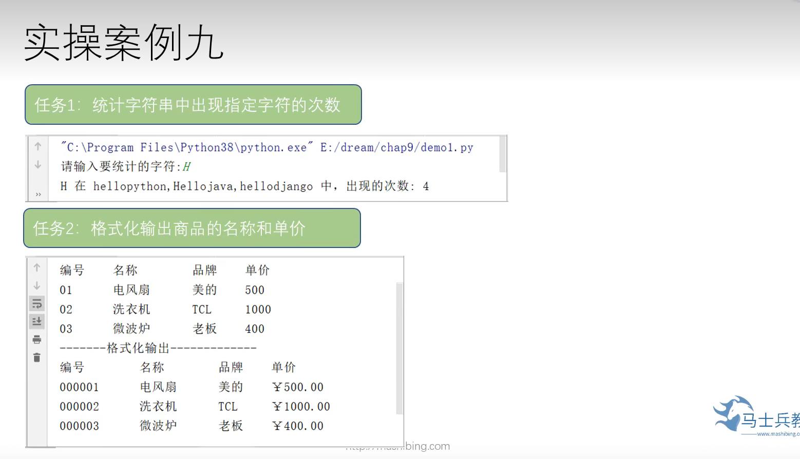 def show(lst): for i in lst: for item in i: print(item, end='\t\t') print() lst = ['01', '电风扇', '美的', 500], ['02', '洗衣机', 'TCL', 1000], ['03', '微波炉', '老板', 400] print('编号\t\t名称\t\t\t品牌\t\t单价') show(lst) print('------------------字符串的格式化-------------------------') print('编号\t\t\t名称\t\t\t品牌\t\t单价') for i in lst: i[0] = '0000' + i[0] i[3] = '¥{:.2f}'.format(i[3]) show(lst)