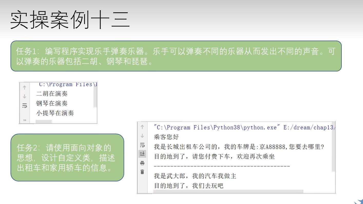 class Car(object): def __init__(self, type, no ): self.type = type self.no = no def start(self): pass def stop(self): pass class Taxi(Car): def __init__(self, type, no, company): super().__init__(type, no) self.company = company def start(self): print('乘客您好!') print(f'我是{self.company}出租车公司的,我的车牌号是{self.no},请问您要去哪里?') def stop(self): print('目的地到了,请您付款下车,欢迎再次乘坐') class FamilyCar(Car): def __init__(self, type, no, name): super().__init__(type, no) self.name = name def stop(self): print('目的地到了,我们去玩儿吧') def start(self): print(f'我是{self.name},我的车牌号是{self.no},我的汽车我做主') if __name__ == '__main__': taxi = Taxi('上海大众', '京A 9 3 5 3 2', '长城') taxi.start() taxi.stop() print('-'*30) familycar = FamilyCar('广汽丰田', '京B888888', '武大郎') familycar.start() familycar.stop()