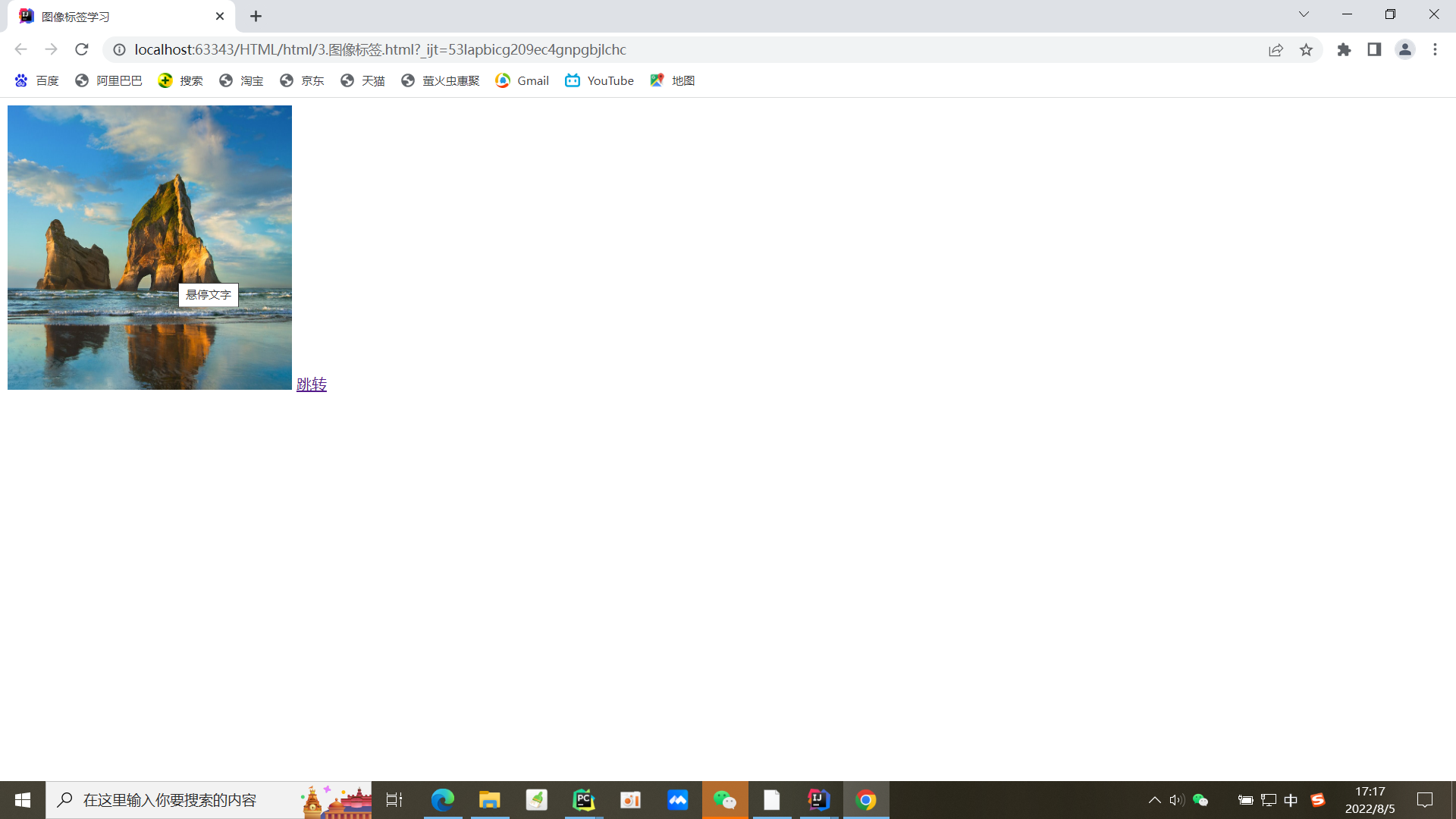 <!DOCTYPE html> <html lang="en"> <head> <meta charset="UTF-8"> <title>图像标签学习</title> </head> <body> <!--img学习 src:图片地址(必填) 相对地址,绝对地址 ../ --上一级目录(相对地址) alt:图片名字(必填) --> <img src="../resource/image/1.png" alt="桌面图像"title="悬停文字"width="300"height="300"> <a href="4.链接标签.html#down">跳转</a> </body> </html>