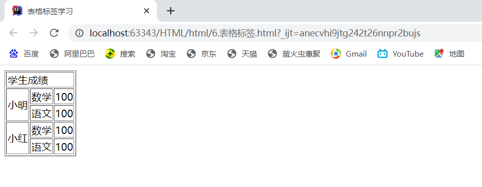 <!DOCTYPE html> <html lang="en"> <head> <meta charset="UTF-8"> <title>表格标签学习</title> </head> <body> <!--表格table 行 tr 列 td --> <table border="1px" > <tr> <!--colspan 跨列--> <td colspan="3">学生成绩</td> </tr> <tr> <!--rowspan 跨行--> <td rowspan="2">小明</td> <td>数学</td> <td>100</td> </tr> <tr> <td>语文</td> <td>100</td> </tr> <tr> <!--rowspan 跨行--> <td rowspan="2">小红</td> <td>数学</td> <td>100</td> </tr> <tr> <td>语文</td> <td>100</td> </tr> </table> </body> </html>