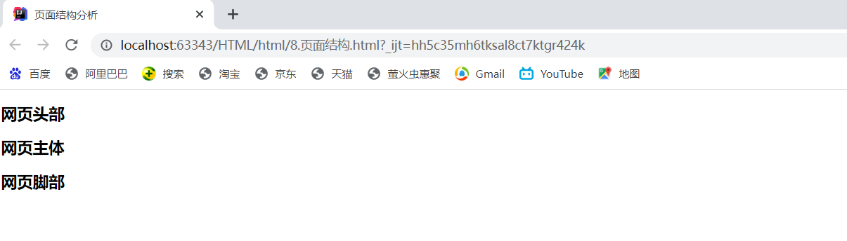 <!DOCTYPE html> <html lang="en"> <head> <meta charset="UTF-8"> <title>页面结构分析</title> </head> <body> <heard> <h2>网页头部</h2> </heard> <section> <h2>网页主体</h2> </section> <foot> <h2>网页脚部</h2> </foot> </body> </html>