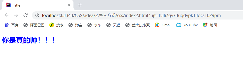 <!DOCTYPE html> <html lang="en"> <head> <meta charset="UTF-8"> <title>Title</title> <!--导入式--> <style> @import url("style.css"); </style> </head> <body> <h1>你是真的帅!!!</h1> </body> </html>