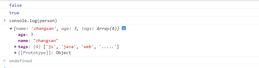 <!DOCTYPE html> <html lang="en"> <head> <meta charset="UTF-8"> <title>Title</title> <script> console.log((1/3) === (1-2/3))//结果为false,尽量避免使用浮点数进行运算,因为存在精度问题! console.log(Math.abs((1/3) - (1-2/3))<0.00000001) //保证代码的可读性,尽量使用[] var arr =[1,23,5,3,6,'hello world',null,true] //对象是大括号,数组是中括号 //每个属性之间使用逗号隔开,最后一个不需要添加 //Person person = new Person(1,2,3,4,5); var person = { name:"zhangsan", age:3, tags:['js','java','web','.....'] } </script> </head> <body> </body> </html>