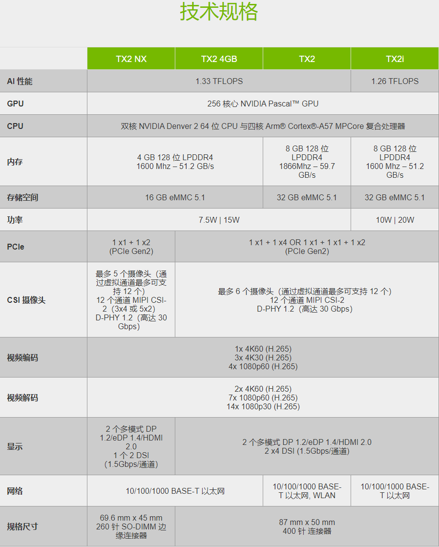 以低至 7.5 瓦的功耗在边缘设备上运行大型深度神经网络并获得更高的准确性。Jetson TX2 系列模组非常适用于实时处理需要解决带宽和延迟问题的应用程序,包括工厂机器人、商用无人机和企业协作设备.