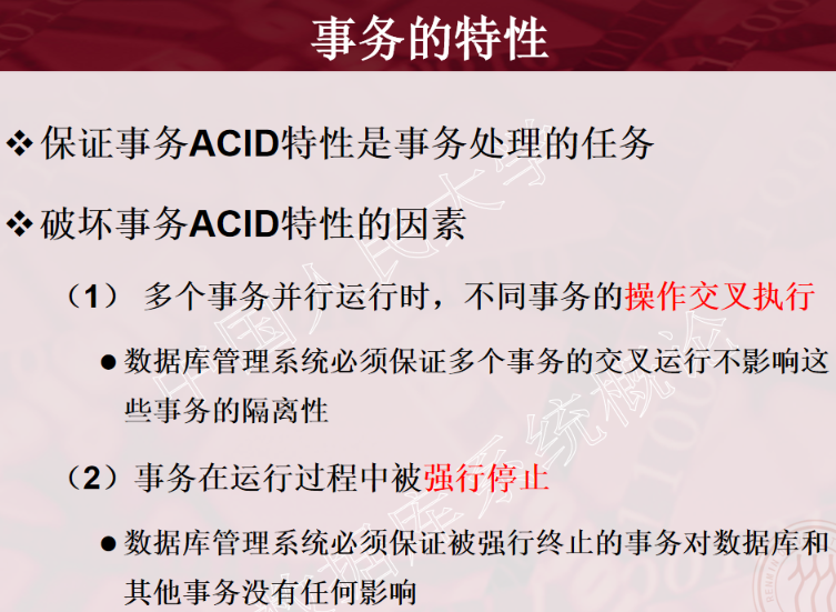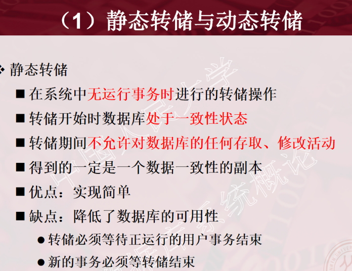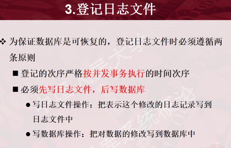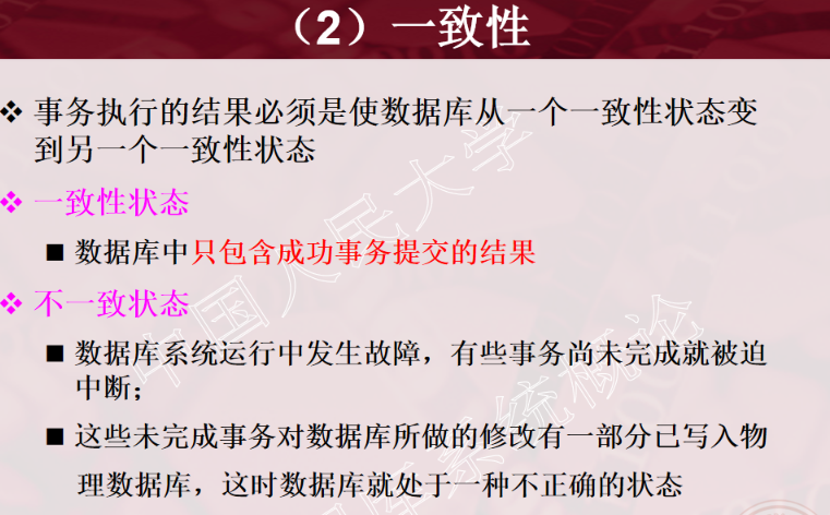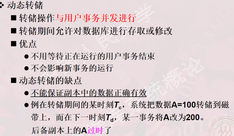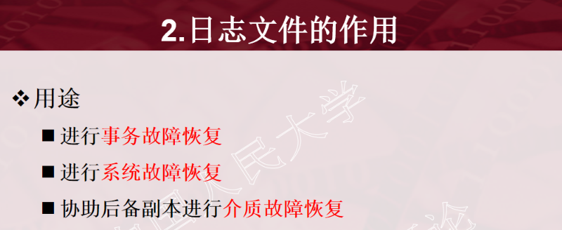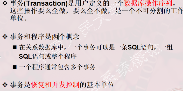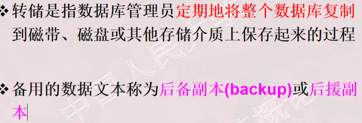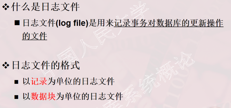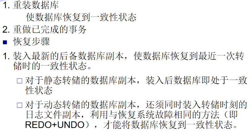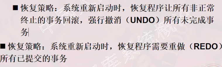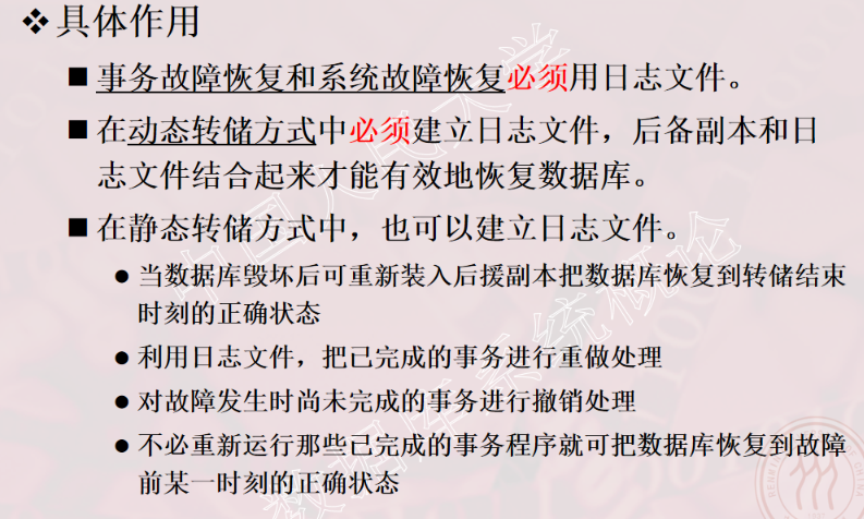 1、事务的概念 2、事务的ACID特性 3、事务故障的种类(注意:要加上计算机病毒) 4、数据转储指什么?有哪几种方法? 5、日志文件的作用是什么?登记日志文件所要遵循的原则。 6、事务故故障的恢复。