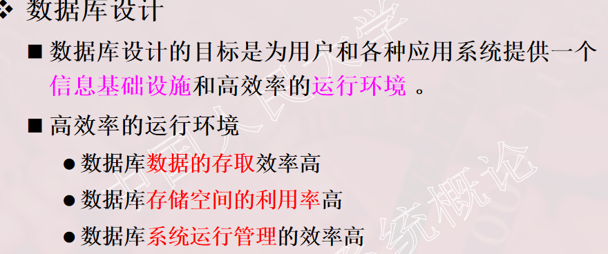 数据库运行与维护:经常性的维护工作由DBA完成:数据库的转储和恢复;数据库的安全性和完整性,根据实际需要授予用户不同的权限和修改完整性约束条件;数据库性能监督、分析和改进;数据库的重组织和重构造。