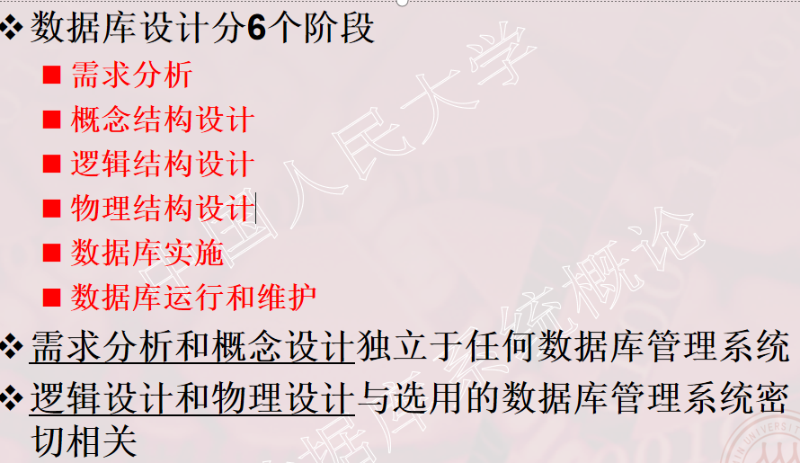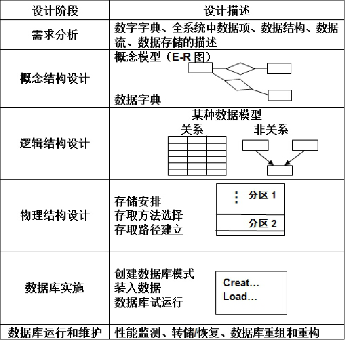 数据库实施阶段:定义数据库结构;数据装载;编制和调试应用程序;数据库试运行,进行功能测试、性能测试;