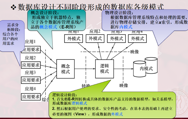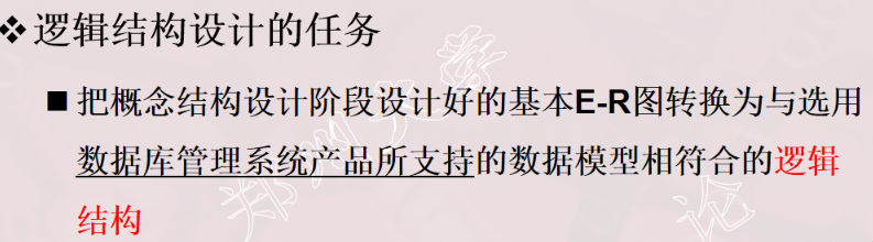 逻辑结构设计:将概念结构模型转化为一般的数据模型;将转化来的数据模型向特定的DBMS支持的数据模型转化;对数据模型进行优化(规范化);设计用户模式;