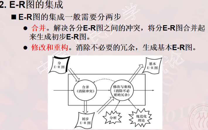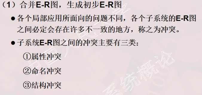 - 集成局部视图,合成总E-R图,消除分E-R图中三类冲突;