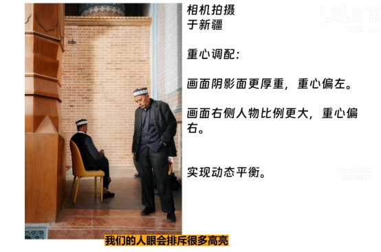 人眼先被亮的部分吸引,但是这张图的很多内容在阴暗面,同上凸显主体,保持画面平衡