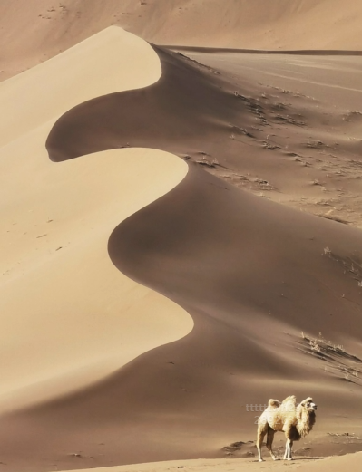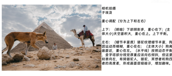 阴影面积大,画面靠右倾斜。然而骆驼在画面右侧,骆驼让阴影面缺失了一部分,本身是亮的,所以让画面产生平衡,把主体照亮放在充满阴影的背景中去凸显主体