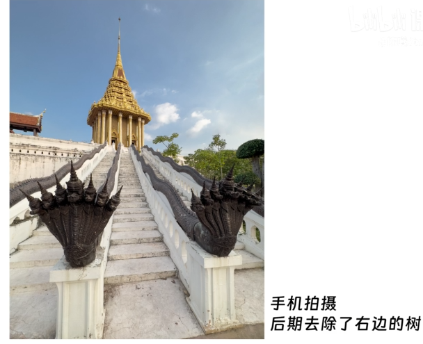 左边的爪子离我们视觉更近,更有张力,而塔还是朝右上方,把画面形成张力但又维持平衡,P掉右边的树是为了不让其他元素影响照片的平衡感