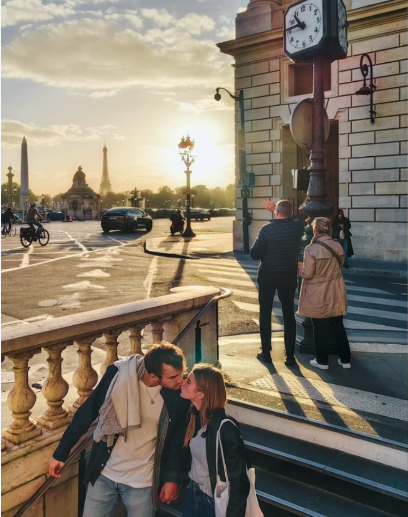 高角度的俯瞰视角,形成三点透视的效果。画面中部是两个行人挡着太阳,日出日落的时间和时钟的时间形成对比,很难在10点钟看到这个太阳的日出日落。后景有埃菲尔铁塔等元素,画面形成层次分明