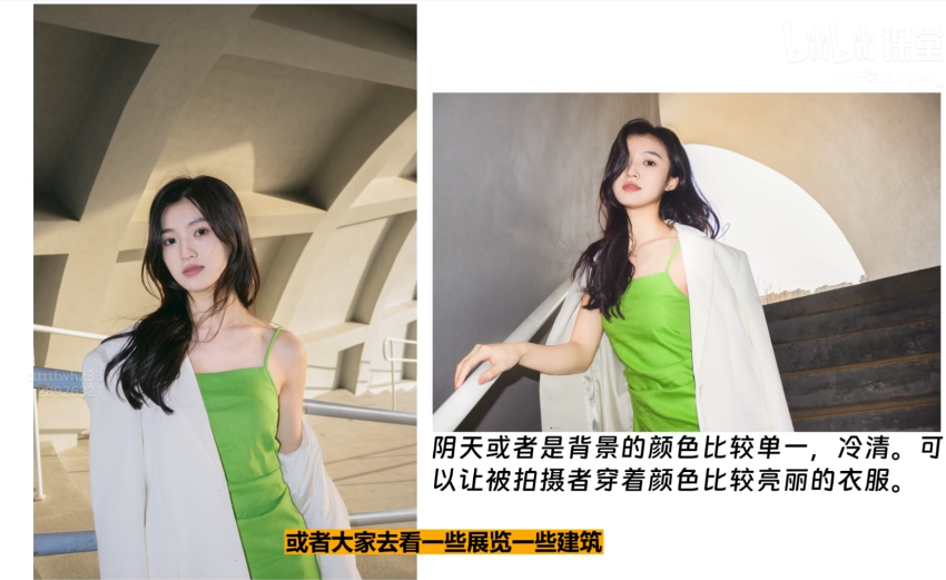 阴天或者展览的情况,人物更适合穿一些鲜艳的衣服
