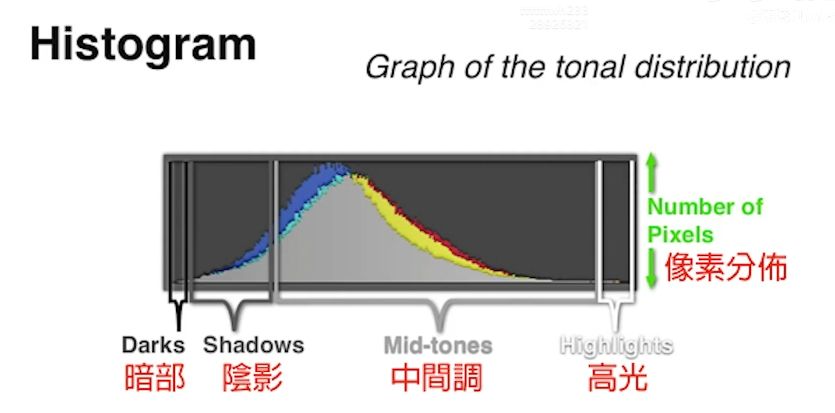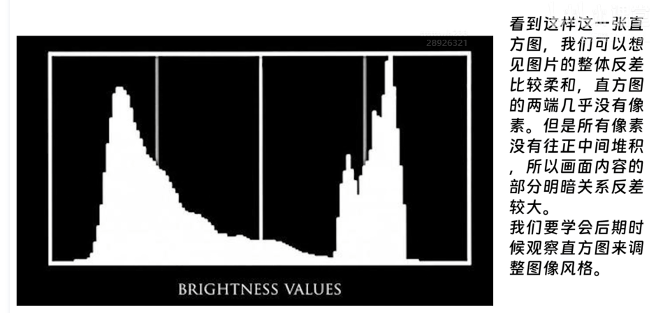 直方图: 可以看到一张图的亮度。对比度比较高的图像像两边堆集,比较素雅的图形,日系小清新是低对比度的照片