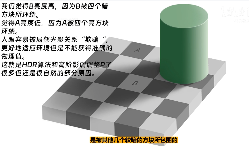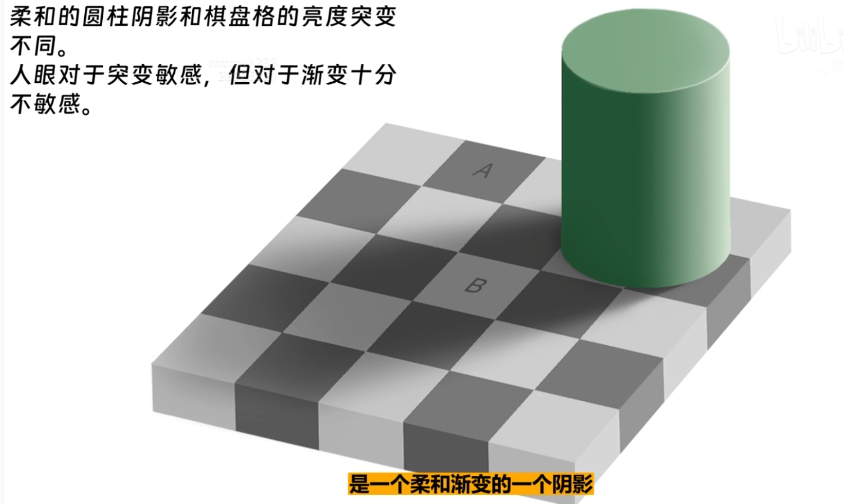 A,B方块的明度和亮度是一致的,但是人的视觉不是