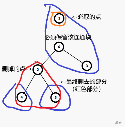 假设我们已经找到了一个必取(不可删)的节点 \(v\),并让该连通块变成以 \(v\) 为根的树。(至于为什么是连通块而不是整个图,后面会说)