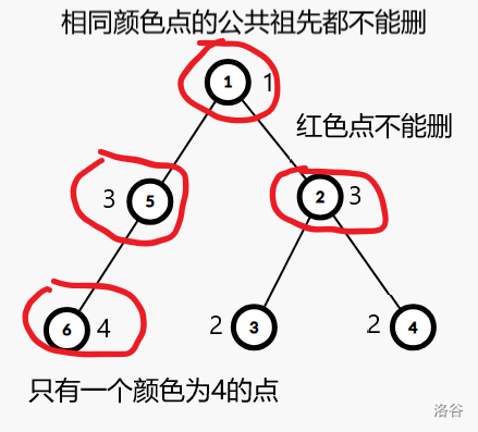 else l=lca(pos1[i],pos2[i]);//如果有两个同颜色的节点未被删,则它们的公共祖先都不能删