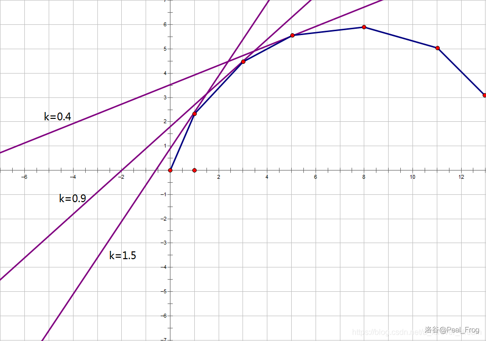 设 \(g(x)\) 是恰好选 \(x\) 个的答案,则最终答案就是 \(g(p)\)。而这个 \(g(x)\) 直接算很难算出来,或者说我们无法一开始就得到,但我们发现 \(g(x)\) 具有凹凸性。如果对于所有 \(x\) ,我们在平面直角坐标系上放入点 \((x,g(x))\) ,这些点构成一个凸壳,相邻之间的斜率具有单调性。