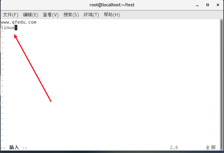 进入编辑模式后,左下角出现“--插入--”,可以随意输入文本内容,Vim编辑器不会把文本内容当作命令执行。
