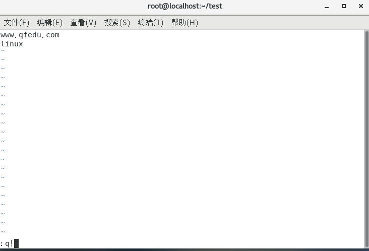 [root@localhost test]# more qf.txt” less “——对文件和其他输出进行分页显示,可用pageup,pagedown与键盘方向键来上下翻看文件,最后按q键退出