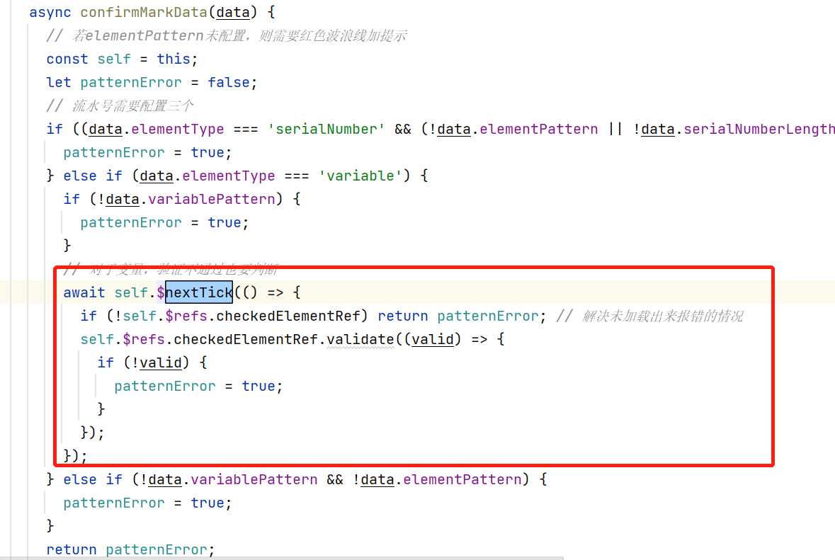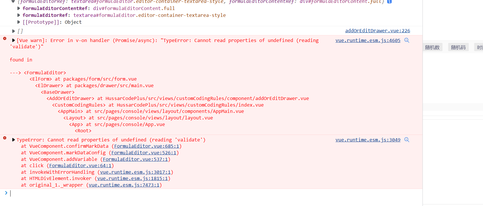 查阅发现是我是用了v-show/v-if控制表单的显隐,ref是作为渲染结果被创建的,页面刚开始加载的时候该组件还没有被渲染出来,因此访问不到,而且$ref不是响应式的。