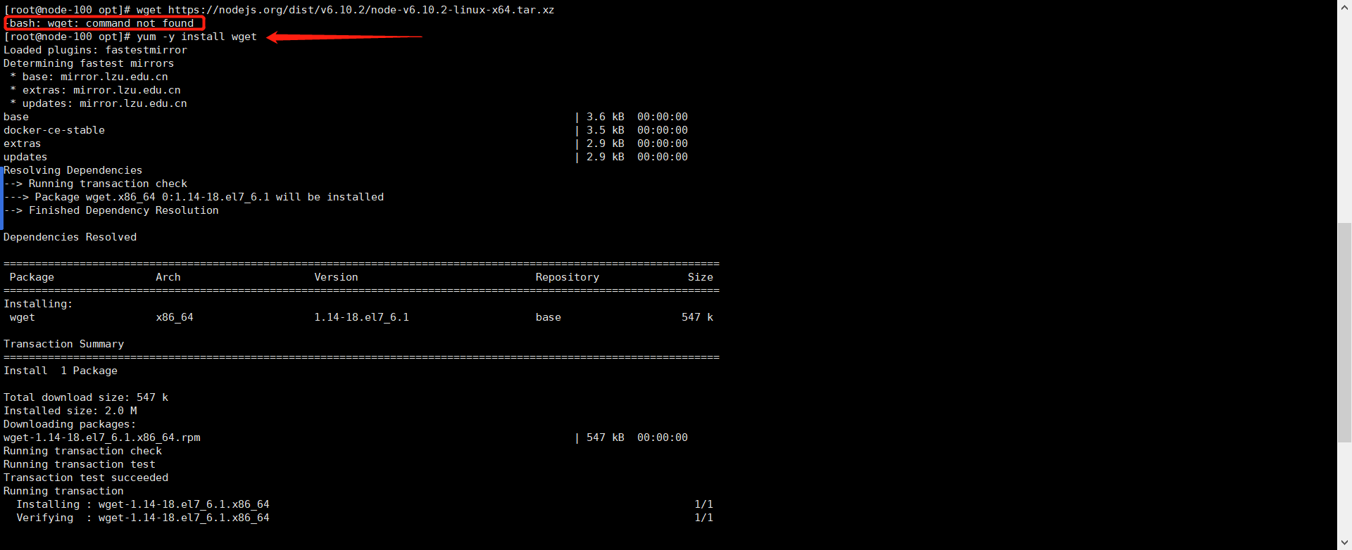 如下图所示, 我们在使用wget命令时,提示command not found时,说明没有安装wget;