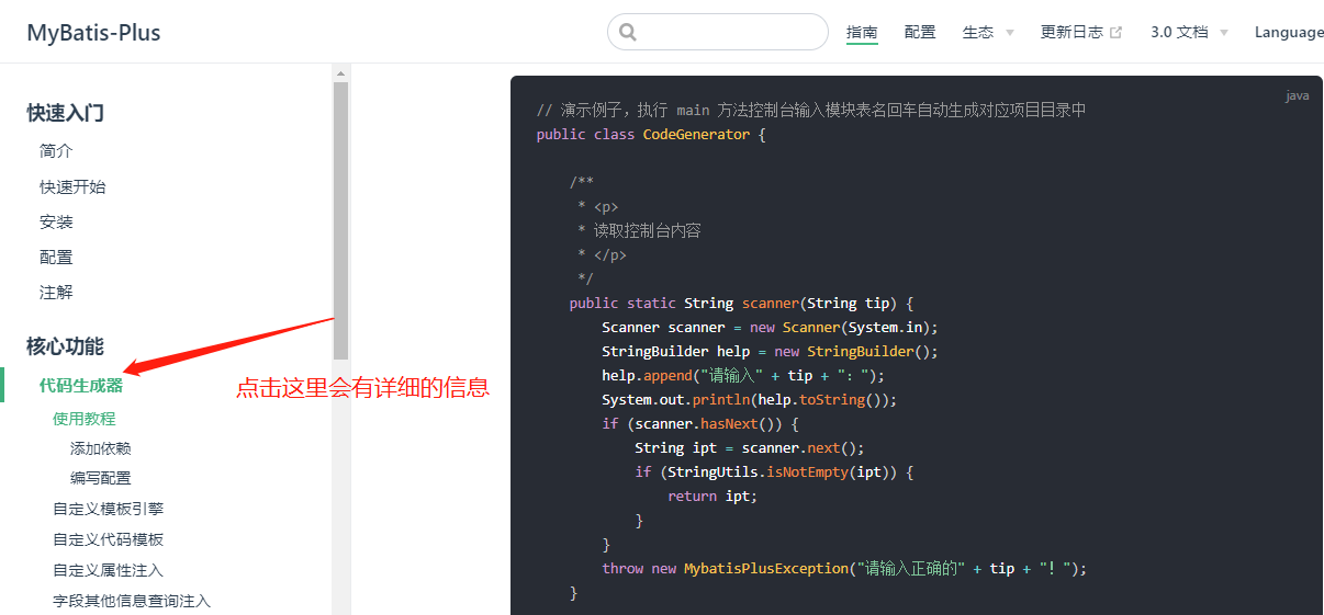 1、可以在浏览器上面搜索MyBatis plus,在快速入门文档里面,有一个核心功能模块,第一个就是代码生成器