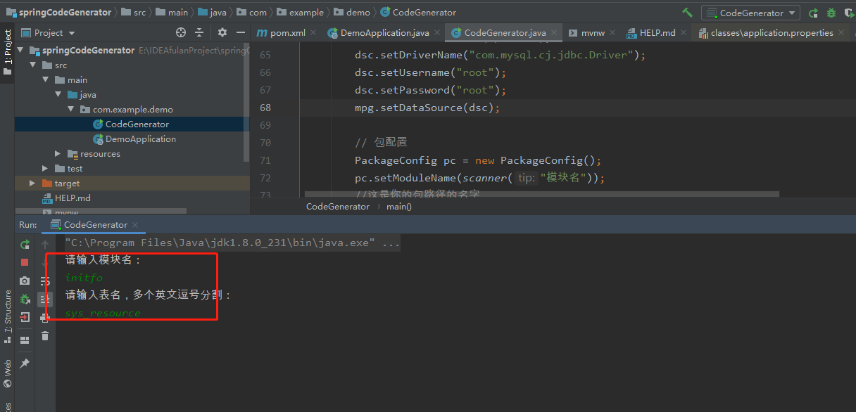 5、提示输入模块名和输入表名,多个表之间按照 逗号(,) 隔开