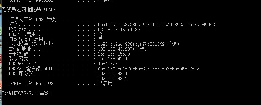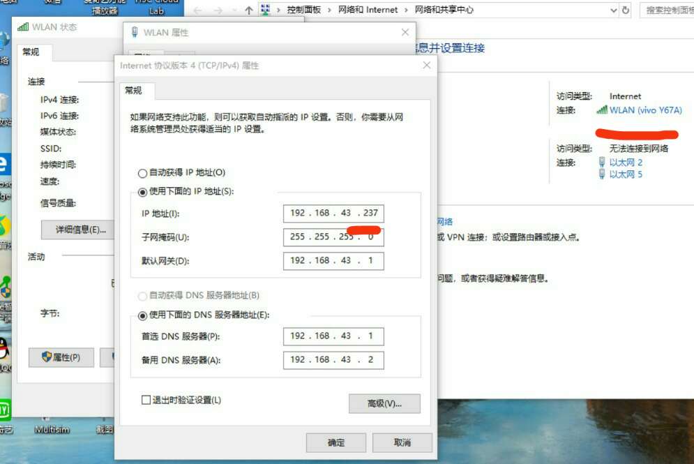注:以太网的IP修改后无法,学校网无法识别。所以连接的是手机热点。