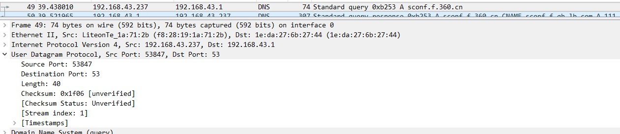 DNS使用UDP协议,打开DNS报文查看UDP相应信息