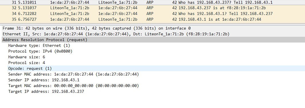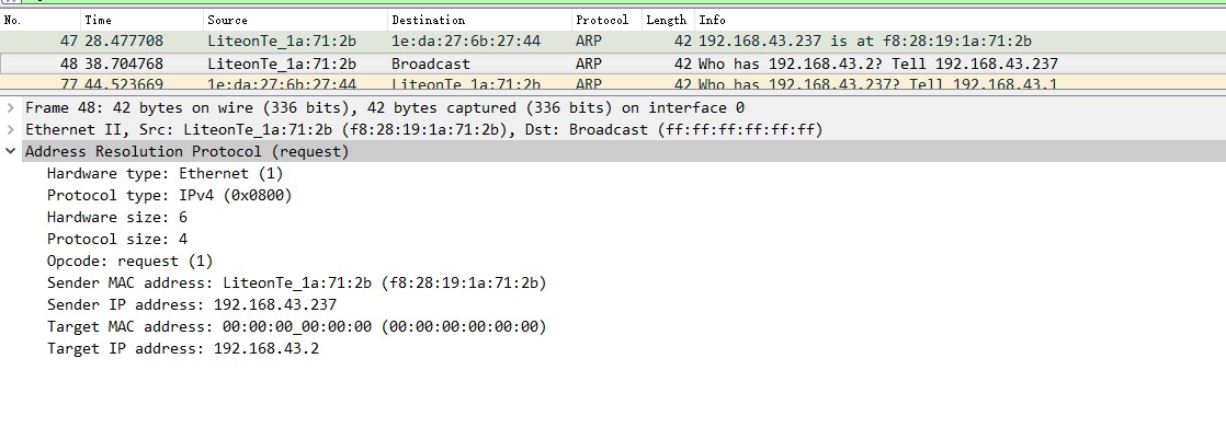 选择一个ARP报文查看信息,分析MAC地址