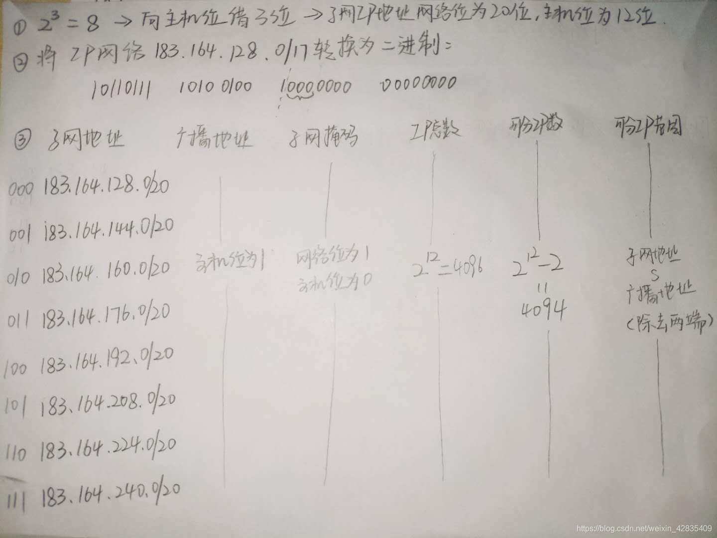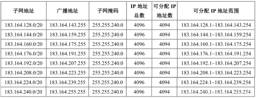 8.请将IP网络183.164.128.0/17划分为等长的8个子网,并分别给出每个子网的子网地址、广播地址、子网掩码、IP地址总数、可分配IP地址数和可分配IP地址范围。 P151