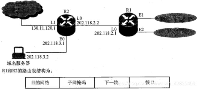 13、某网络拓扑图如图所示,路由器R1通过接口E1、E2分别连接局域网1、局域网2,通过接口L0连接路由器R2,并通过路由器R2连接域名服务器与互联网。R1的L0接口的IP地址是202.118.2.1;R2的L0接口的IP地址是202.118.2.2,L1接口的IP地址是130.11.120.1,E0接口的IP地址是202.118.3.1;域名服务器的IP地址是202.118.3.2。 P153