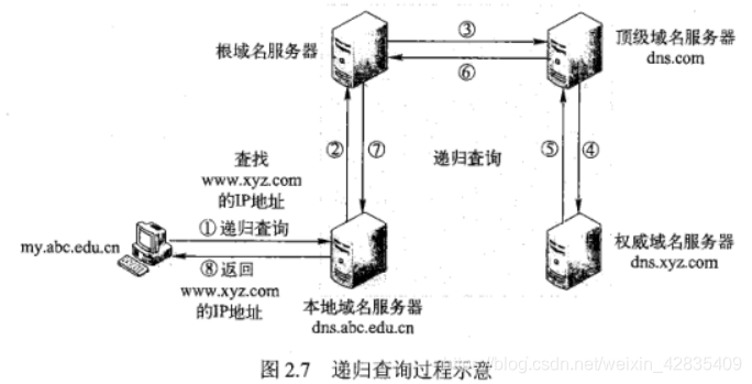 1)递归解析:提供递归查询服务的域名服务器,可以代替查询主机或其他域名服务器,进行进一步的域名查询,并将最终解析结果发送给查询主机或服务器。(图2.7例子)
