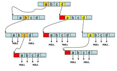 如下图是一个常见的用来存英文单词的trie:(图转自http://blog.csdn.net/zslomo/article/details/53434883)