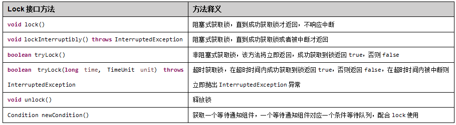 下面我们先看看Lock接口对外提供的需要开发者实现的接口方法: