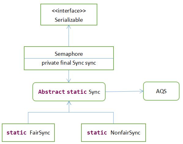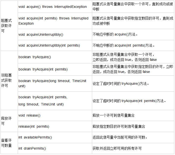 Semaphore主要的方法就这些了,还有几个返回等待队列状态的方法很简单就不列举了。从列举的方法可以看出,其主要集中对在阻塞式和非阻塞式获取许可的实现。下面我们对主要的方法源码进行分析。