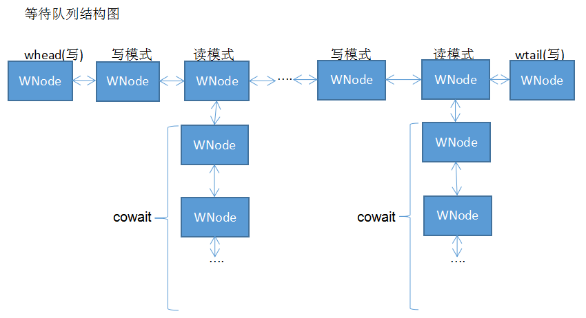 而且有意思的是在获取悲观读和写锁的过程中,都会有意识的辅助头节点唤醒它的cowait链中的读线程。阻塞式的读写锁获取方法在成功获取相关的锁之后都会返回一个反应锁信息的long型stamp变量,这个返回值对于上层调用者来说基本上是没有什么作用的,主要是为了用于作为释放锁的参数,通过对读写锁的分析,我们大致也可以得出它对整个等待队列的维护结构如下: