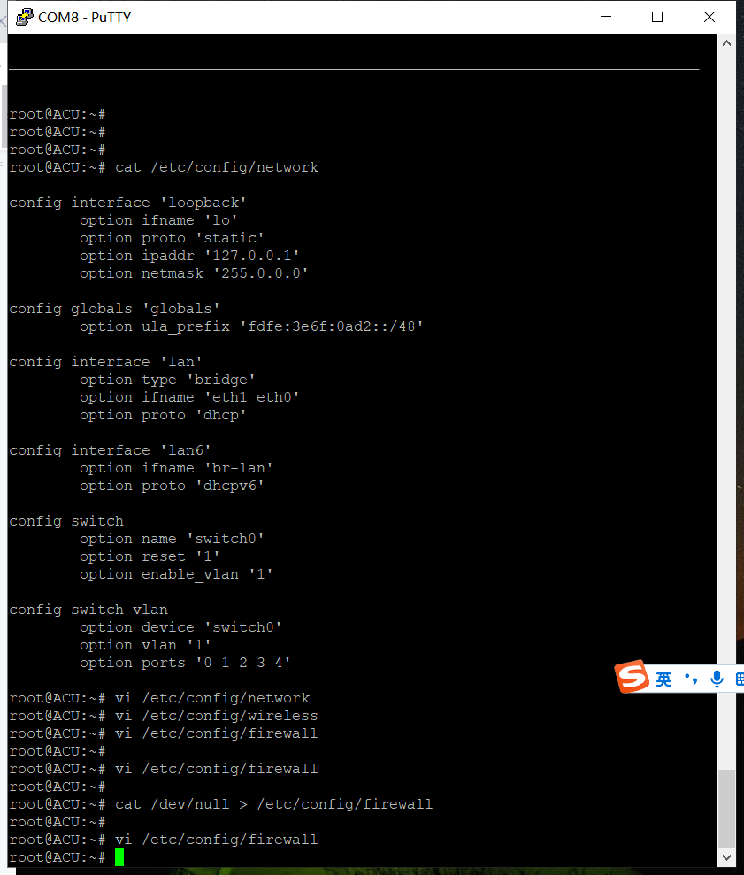 上述中 cat /dev/null > /etc/config/firewall 意思上是将 firewall 中的文件给替换成空白的,将4个文件夹中的内容替换为网桥文档中的内容。