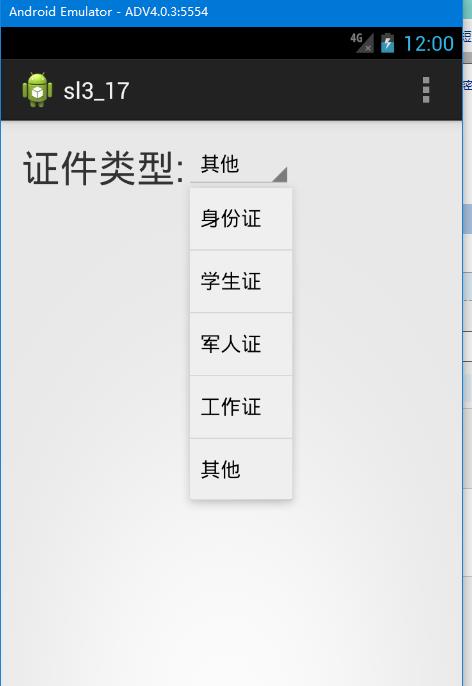 <RelativeLayout xmlns:android="http://schemas.android.com/apk/res/android" xmlns:tools="http://schemas.android.com/tools" android:layout_width="match_parent" android:layout_height="match_parent" android:paddingBottom="@dimen/activity_vertical_margin" android:paddingLeft="@dimen/activity_horizontal_margin" android:paddingRight="@dimen/activity_horizontal_margin" android:paddingTop="@dimen/activity_vertical_margin" tools:context="com.example.sl3_17.MainActivity" > <TextView android:id="@+id/textView1" android:layout_width="wrap_content" android:layout_height="wrap_content" android:textSize="30dp" android:text="@string/hello_world" /> <Spinner android:id="@+id/spinner1" android:layout_width="wrap_content" android:layout_height="wrap_content" android:layout_toRightOf="@+id/textView1" android:entries="@array/ctype" /> </RelativeLayout>