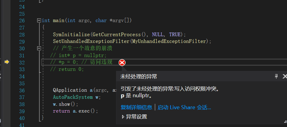 // 产生一个故意的崩溃-- int* p = nullptr; *p = 0; // 访问违规 return 0;