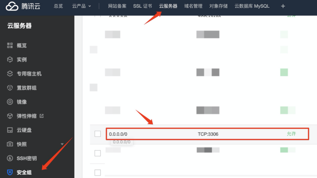 - 但需要在腾讯云“控制台”开启 mysql 端口的权限,如下